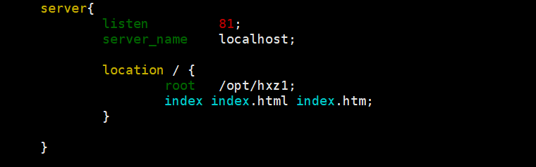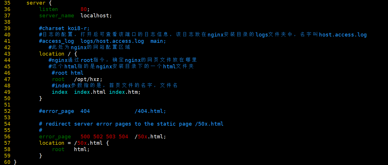 找到server{}下的location处,将 location{ root html }里的html改为自己想要放置的静态网站目录路径(该处的html指nginx安装目录下的一个html文件夹),如下图所示,我将html改为 /opt/hxz;意思是我将会把即将创建的静态页面放在名为hxz的文件夹下。