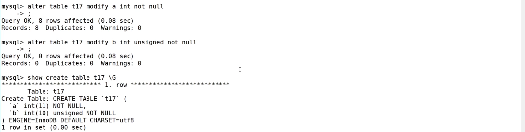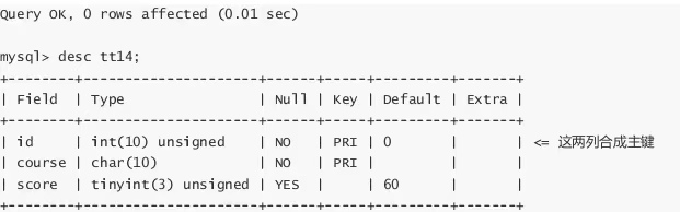 mysql> create table tt14( -> id int unsigned, -> course char(10) comment '课程代码', -> score tinyint unsigned default 60 comment '成绩', -> primary key(id, course) -- id和course为复合主键 -> );