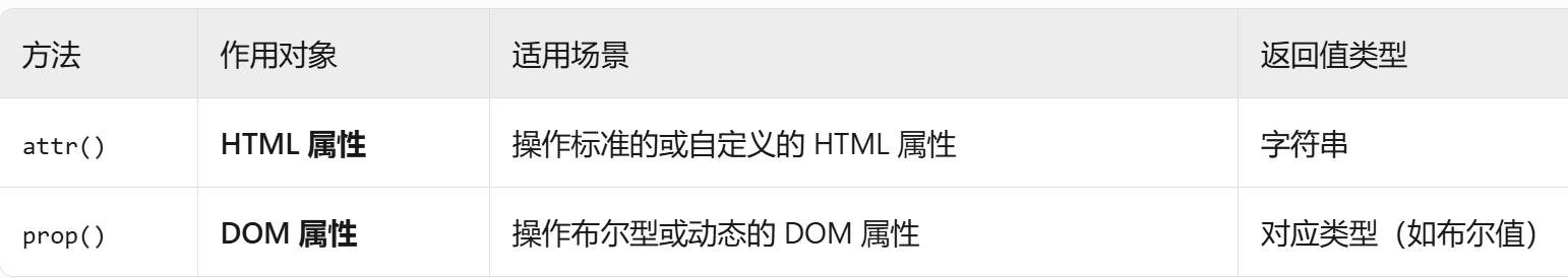 具有 true 和 false 两个值的属性,如 checked, selected 或者 disabled 使用prop(),其他的使用 attr()