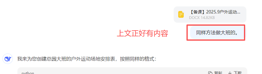 托班表格是这个样子的,靠我自己来提取轮换内容很复杂。所以我把这个表格输入Deepseek,让它来识别word里面的内容,提取运动列表。