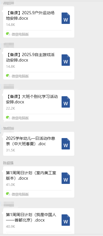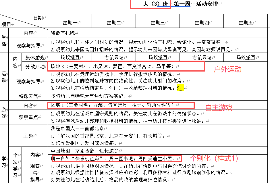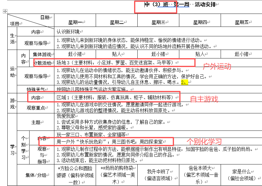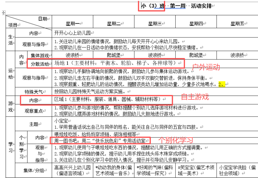 开学在即,大班组长发了本学期的“户外运动”“自主游戏”“个别化”“周计划”模版