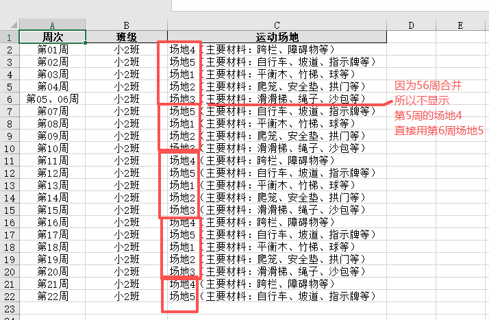 # Python,读取附件里的信息,做成excle表,共22周,其中5、6周合并一周,第一列是周次(第01周,第02周补0)第二列是班级,第三列是运动场地(周一到周五只写一个场地)我要完整的场地描述,然后按班级拆分表格,表名是班级。最后ABC列都是垂直居中,但AB是水平居中,C是垂直左对齐