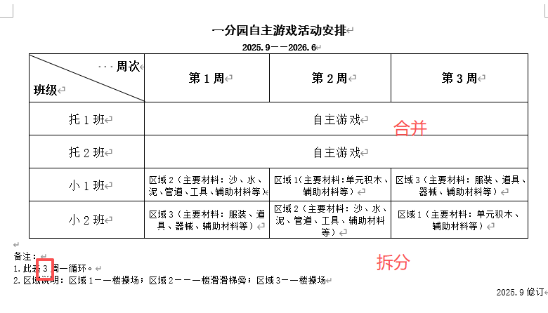 一分园自主游戏托班是合并的,3周都是自主游戏,小班是拆分每周1个,3周轮流的