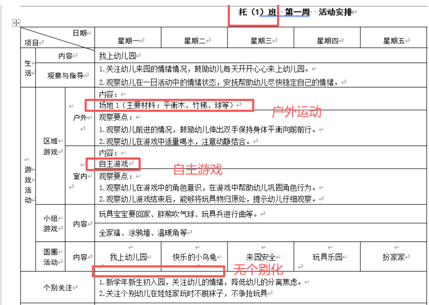 托小中大都有户外运动、自主游戏、但托班没有个别化,中、大班的个别化有两种样式(特殊周5天都是室内美工室,其他周是2-3个活动室活动)
