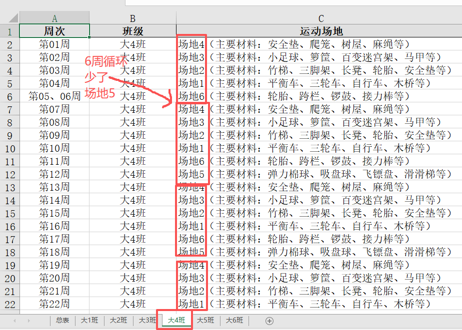 "大4班": "场地6(主要材料:轮胎、跨栏、锣鼓、接力棒等)",