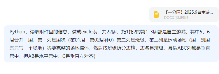Python,读取附件里的信息,做成excle表,共22周,托1托2的第1-3周都是自主游戏,其中5、6周合并一周,第一列是周次(第01周,第02周补0)第二列是班级,第三列是运动场地(周一到周五只写一个场地)我要完整的场地描述,然后按班级拆分表格,表名是班级。最后ABC列都是垂直居中,但AB是水平居中,C是垂直左对齐)