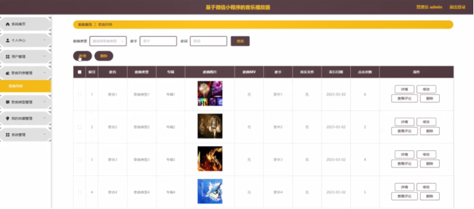 歌曲列表管理;在歌曲列表页面输入歌手、歌词和选择歌手类型进行查询、新增或删除歌曲列表,并对歌曲列表详细信息进行查看详情,修改、查看评论和删除操作;如图5-9所示。