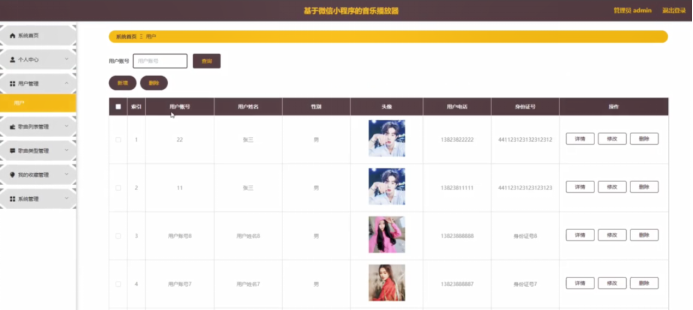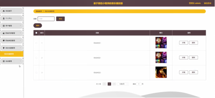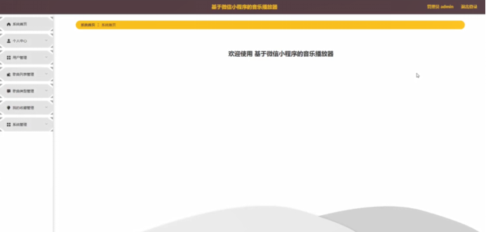 通过管理员登录进入小程序能够查看到系统首页、个人中心、用户管理、歌曲列表管理、歌曲类型管理、我的收藏管理、系统管理等效果进行详细操作,如图5-7所示。