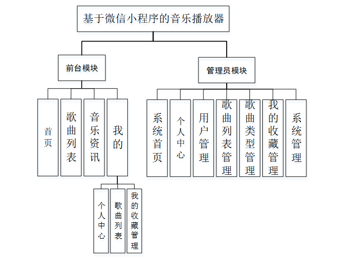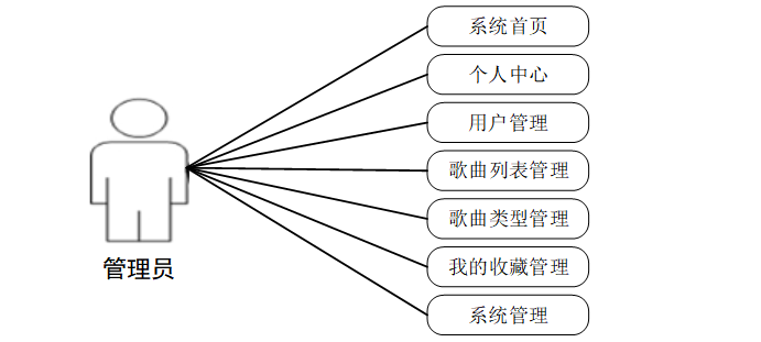 后台主要包括系统首页、个人中心、用户管理、歌曲列表管理、歌曲类型管理、我的收藏管理、系统管理等作用。框架总体作用结构图如图4-1所示。