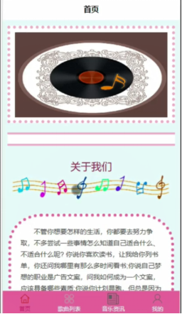 小程序首页是用户注册登录后进入的第一个界面,在这里,人们能够看到小脚本的导航条,内容包括首页、歌曲列表、音乐资讯、我的等。小程序首页界面如图5-3所示。
