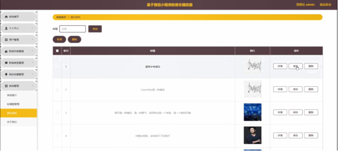 系统管理;在音乐资讯页面输入标题进行查询,新增或删除音乐资讯列表,并对音乐资讯详细信息进行查看详情、修改或删除处理;还可以对系统简介、轮播图管理和关于我们进行详细操作;如图5-11所示。