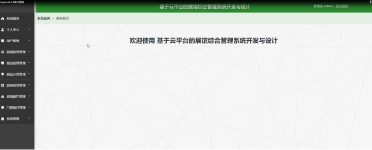 管理员进入主页面,主要功能包括对首页、个人中心、用户管理、展馆信息管理、展品信息管理、展品分类管理、展商信息管理、展馆预约管理、门票预订管理、系统管理等进行操作。管理员主界面如图5-6所示: