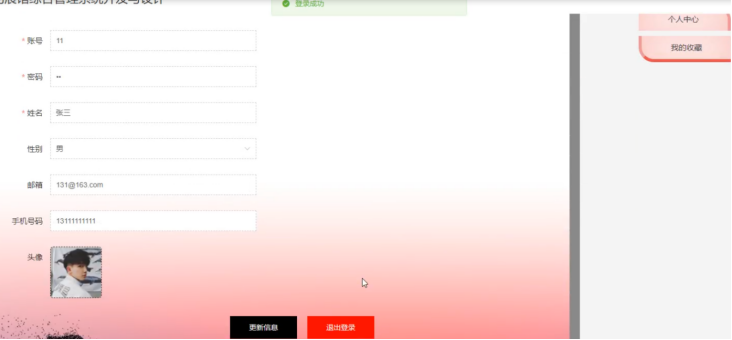 个人中心:在个人中心页面通过填写个人详细信息进行信息更新和退出登录管理,还行对我的收藏进行详细操作;如图5-4所示: