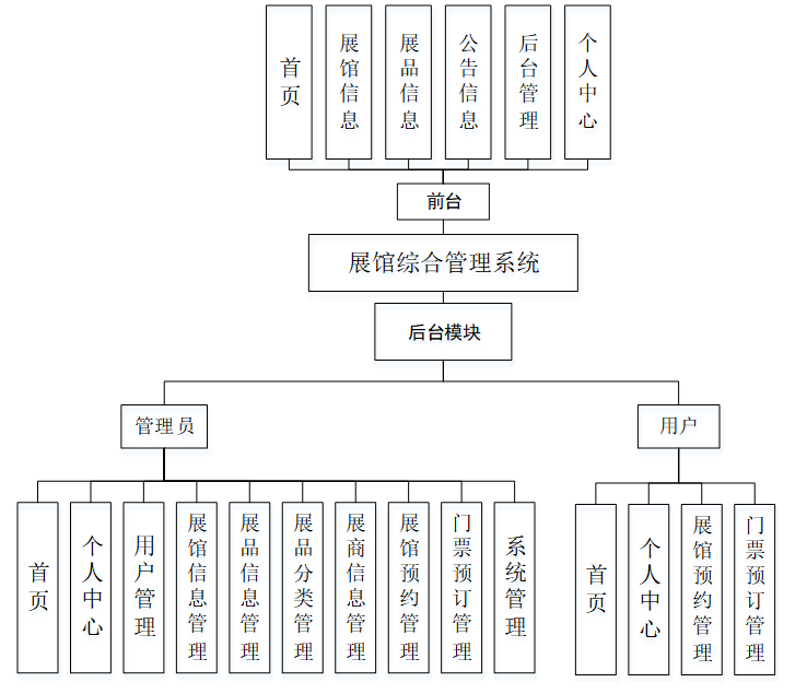 根据上文中对用户需求的一系列综合细致的分析,针对本文展馆综合管理系统,得到一个如图4-1所示的宏观的总体功能结构图。