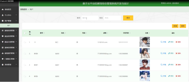 管理员点击用户管理。在用户页面输入账号和姓名进行查询、新增或删除用户列表,并根据需要对用户详情信息进行详情、修改或删除运行;如图5-7所示:
