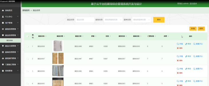 管理员点击展品信息管理。在展品信息页面输入展品名称、展馆名称、展商名称进行查询、新增或删除展品信息列表,并根据应该对展品详情信息进行详情、修改、查看评论或删除操作;如图5-9所示: