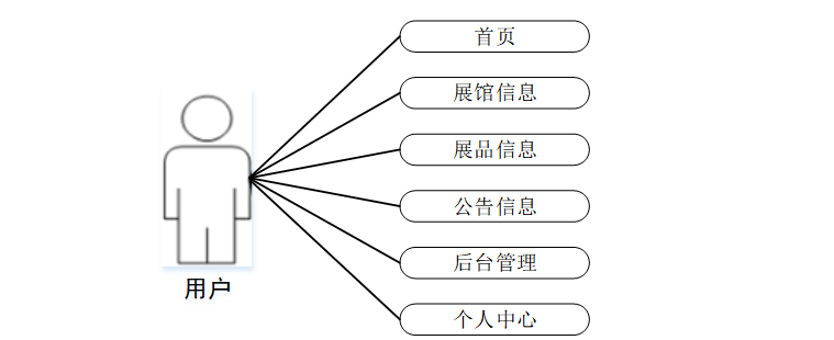 (2)、用户关键功能包含首页、展馆信息、展品信息、公告信息、后台管理、个人中心等进行管理。用户用例如下: