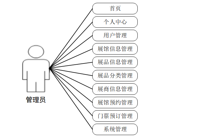 (1)、管理员关键特性囊括首页、个人中心、用户管理、展馆信息管理、展品信息管理、展品分类管理、展商信息管理、展馆预约管理、门票预订管理、系统管理等进行管理。管理员用例如下: