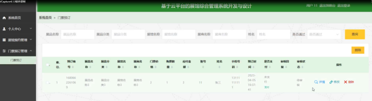 用户点击门票预订管理。在门票预订页面输入展品名称、展品分类、展馆名称、展商名称、姓名、是否通过进行查询或删除门票预订列表,并根据要求对门票预订详细信息进行详情、修改或删除操作。如图5-13所示: