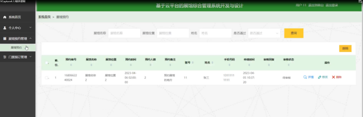 用户点击展馆预约管理。在展馆预约页面输入展馆名称、展馆位置、姓名、是否通过进行查询或删除展馆预约列表,并根据需要对展馆预约详细信息进行详情、修改或删除操作。如图5-12所示: