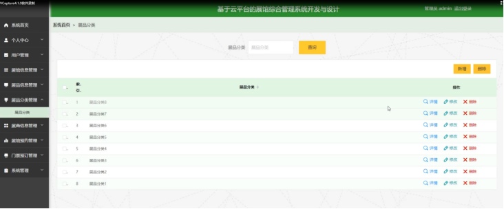 管理员点击展品分类管理。在展品分类页面输入展品分类进行查询、新增或删除展品分类列表,并根据需要对展品分类详情信息进行详情、修改或删除操作;如图5-10所示:
