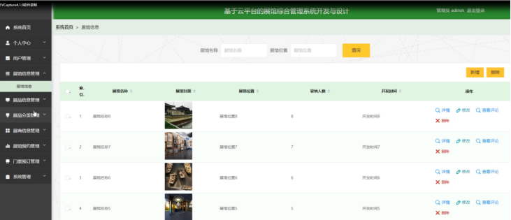 管理员点击展馆信息管理。在展馆信息页面输入展馆名称、展馆位置进行查询、新增或删除展馆信息列表,并根据需要对展馆详情信息进行详情、修改、查看评论或删除操作;如图5-8所示: