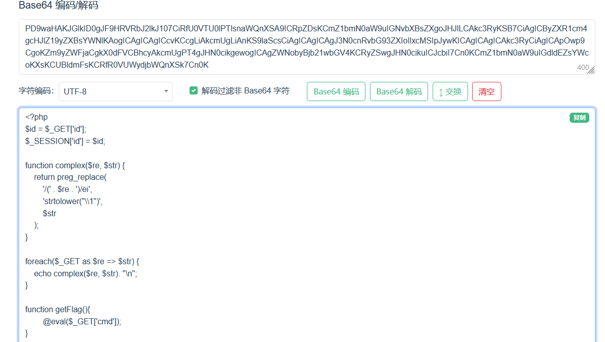 而又因为 e修饰符 ,程序运行时会先执行里面的 ${getFlag()} ,