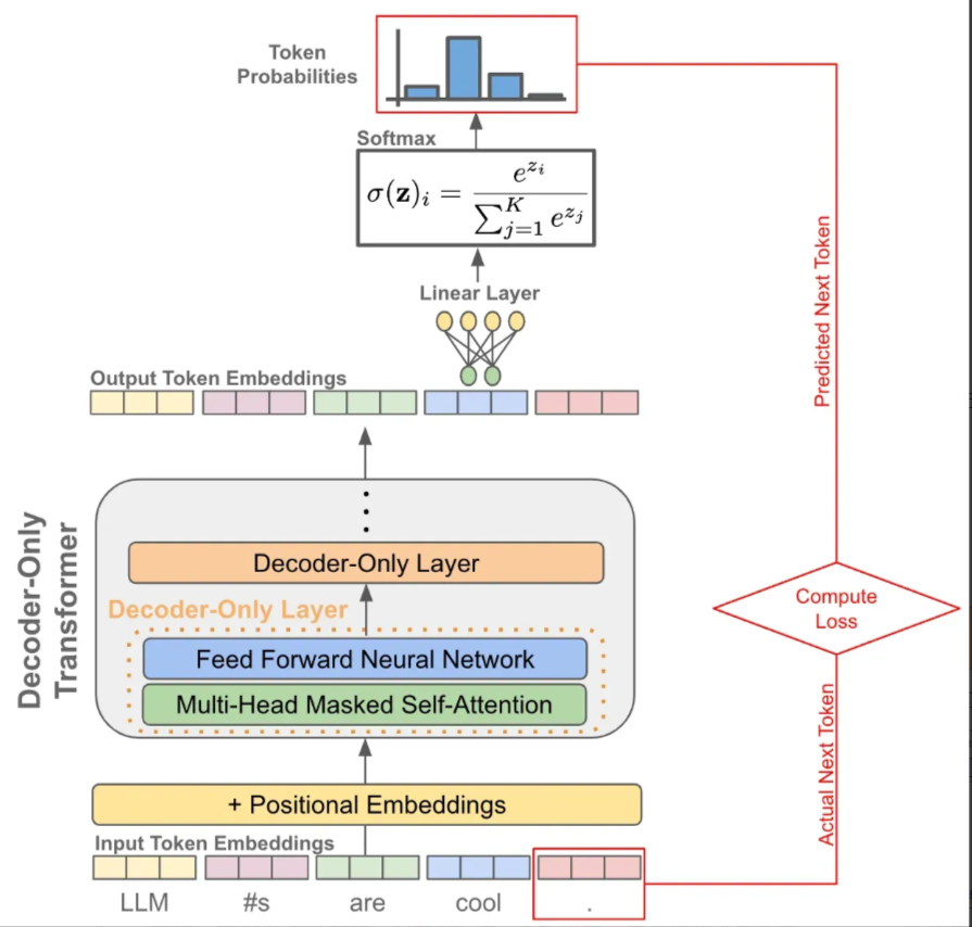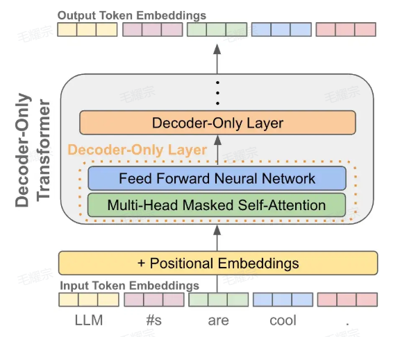 当我们有了token的embedding和位置embedding后,将它们送入一个decoder-only的transofrmer模型,它会在每个token的位置输出一个对应的embedding(可以理解为就像是做了个特征加工)