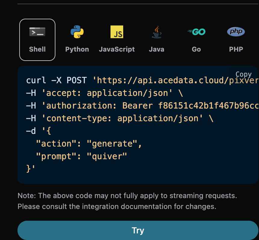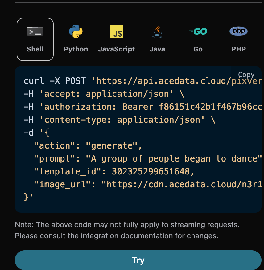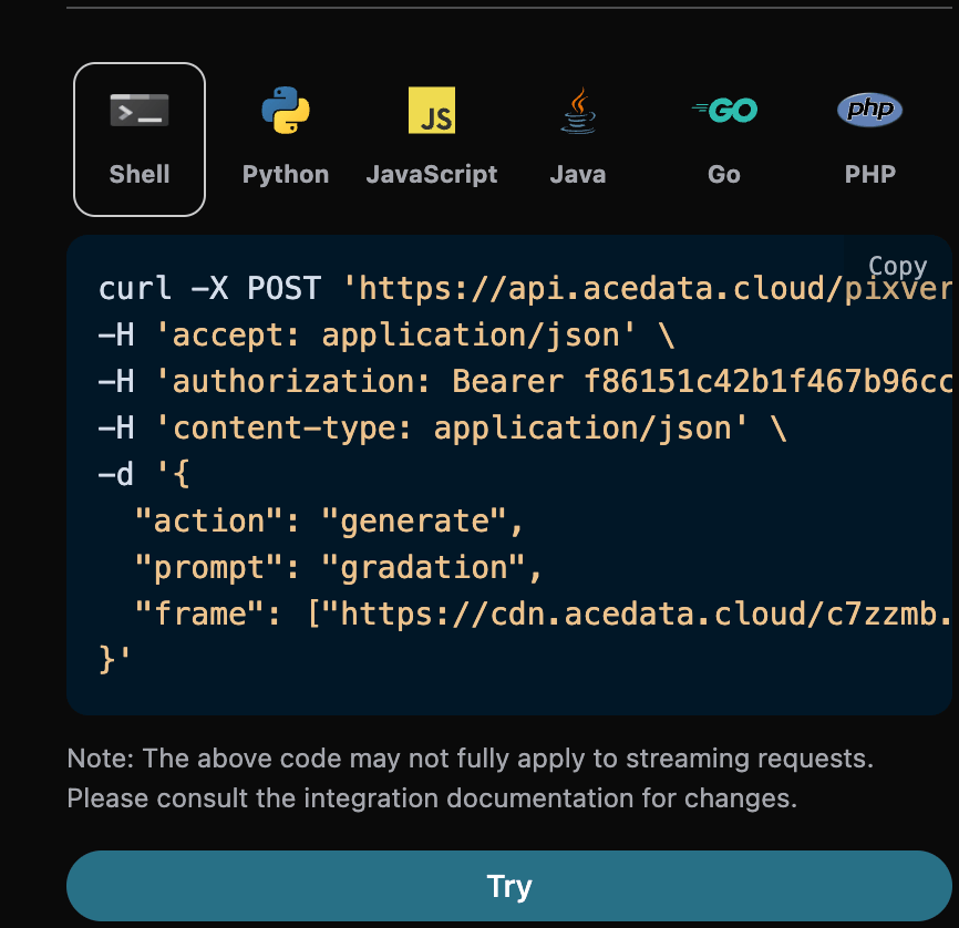 可以点击「Try」按钮直接测试 API,稍等 1-2 分钟,结果如下: