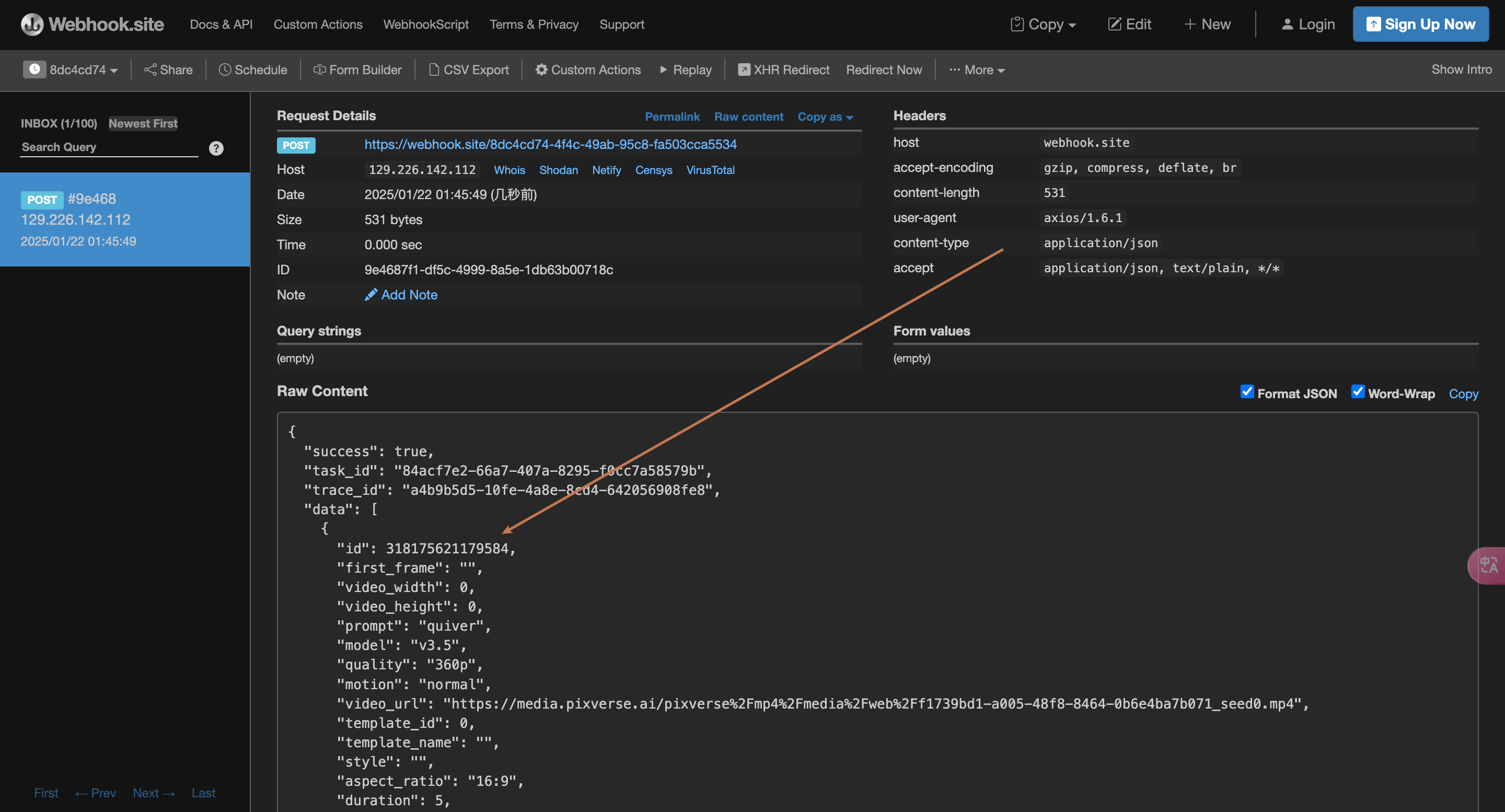 如果想对已经生成的Pixverse视频进行扩展生成的话,可以将参数 action 设置为 extend ,并且输入需要扩展生成视频的 ID,视频 ID 的获取是根据基本使用来获取,如下图所示: