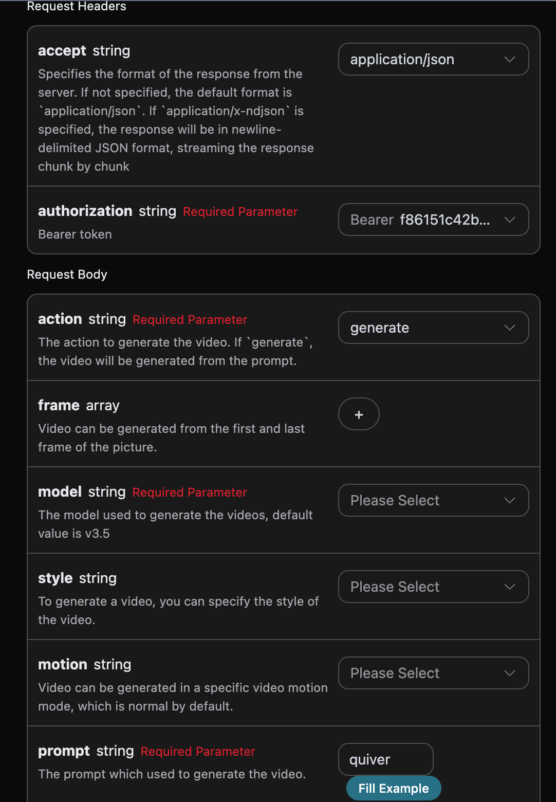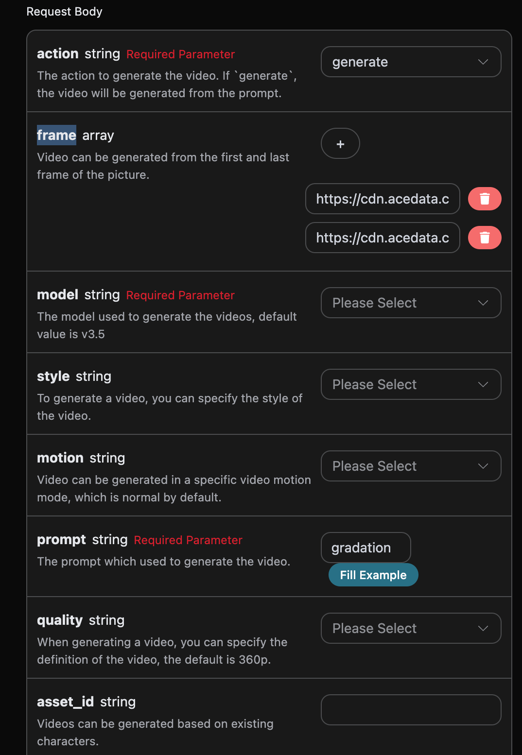 python curl -X POST 'https://api.acedata.cloud/pixverse/videos' \ -H 'accept: application/json' \ -H 'authorization: Bearer {token}' \ -H 'content-type: application/json' \ -d '{ "action": "generate", "prompt": "gradation", "frame": ["https://cdn.acedata.cloud/c7zzmb.png","https://cdn.acedata.cloud/fqd8br.png"] }'