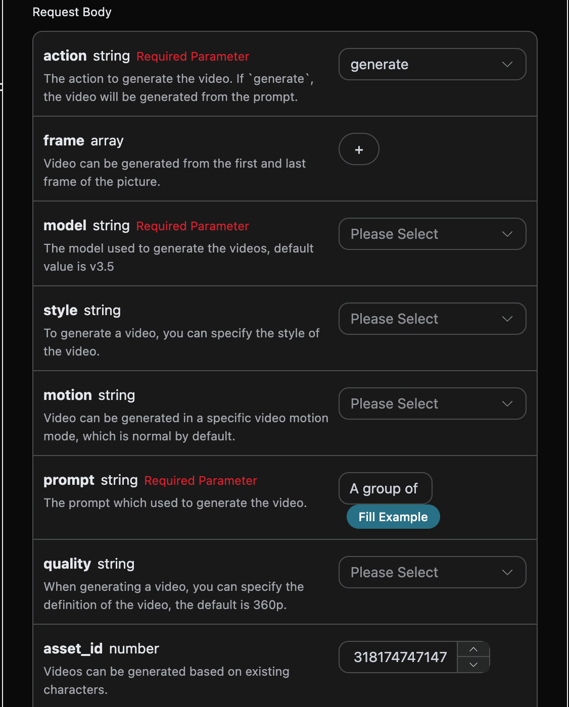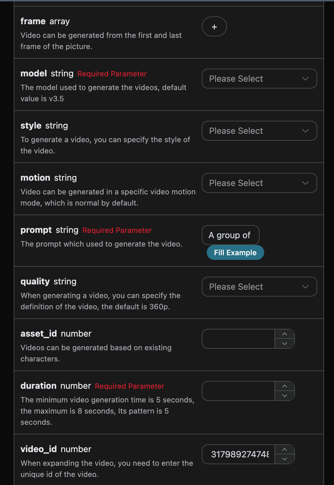 当生成角色ID之后就可以按照基本使用来生成视频了,这里以 asset_id= 318174747147968 为示例,下面是具体的参数: