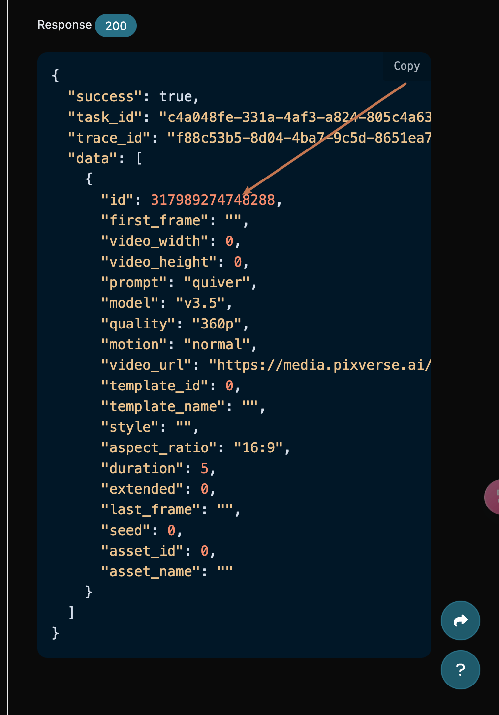 json { "success": true, "task_id": "69e677ca-f1de-419f-99a4-cb39ea0cb5fc", "trace_id": "e544f904-ac13-4b42-a26e-2de69d9ac06b", "data": [ { "id": 317982208110208, "first_frame": "", "video_width": 0, "video_height": 0, "prompt": "quiver", "model": "v3.5", "quality": "360p", "motion": "normal", "video_url": "https://media.pixverse.ai/pixverse%2Fmp4%2Fmedia%2Fweb%2F77e48783-3dc9-48ab-84a0-0e310ff9b83d_seed0.mp4", "template_id": 0, "template_name": "", "style": "", "aspect_ratio": "16:9", "duration": 5, "extended": 0, "last_frame": "", "seed": 0, "asset_id": 0, "asset_name": "" } ] }