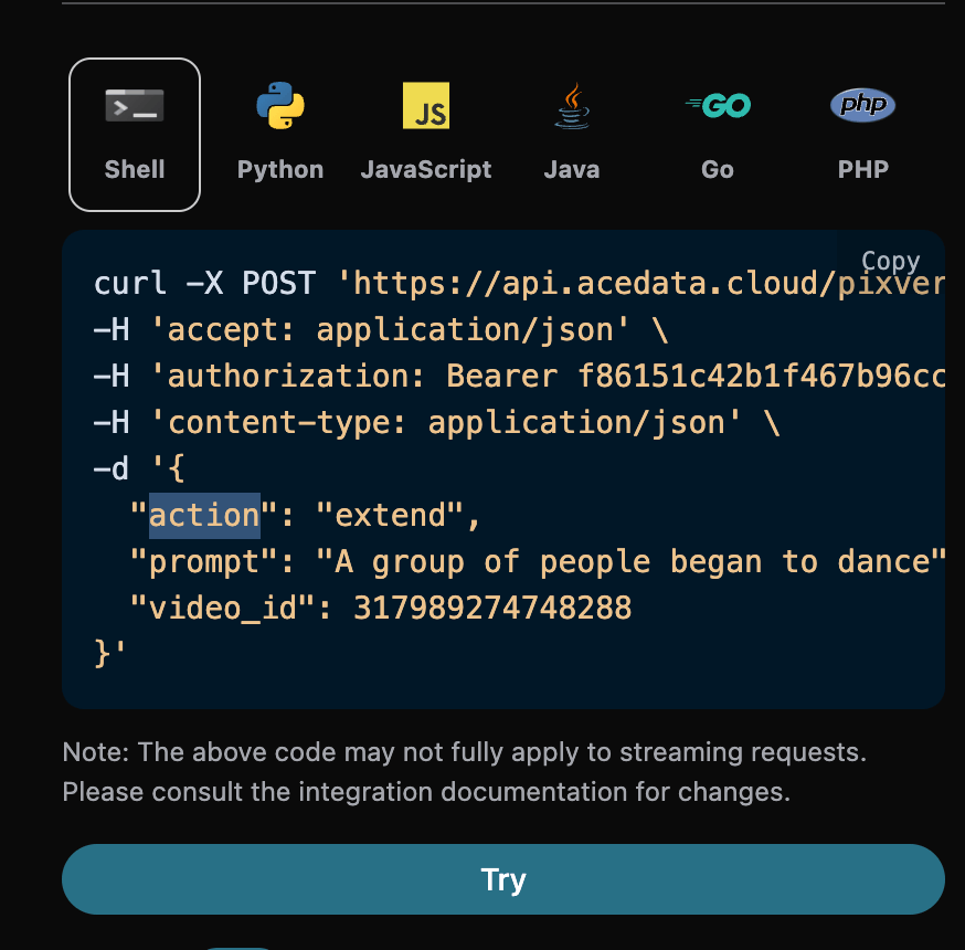 payload = { "action": "extend", "prompt": "A group of people began to dance", "video_id": 317989274748288 }