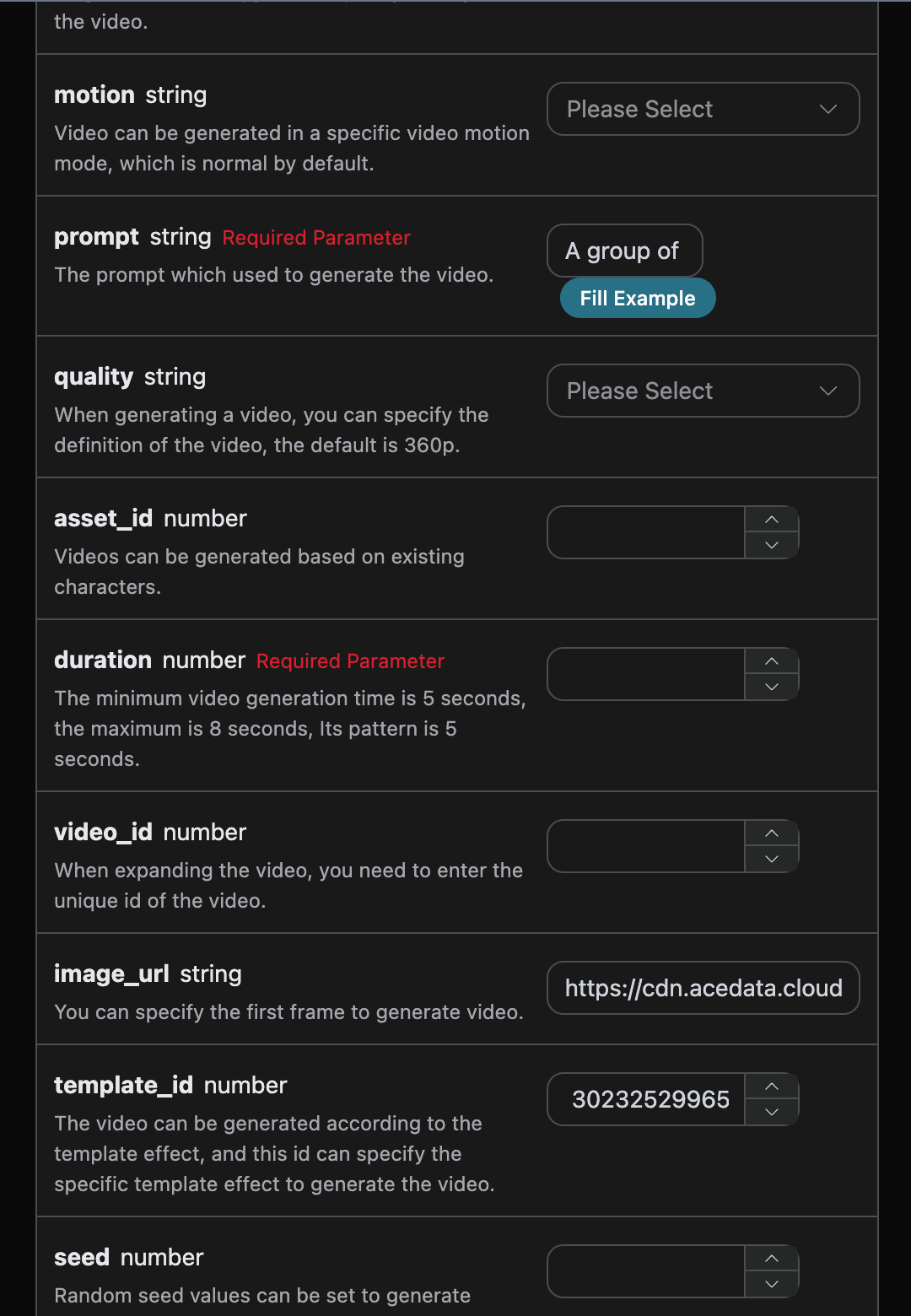 我们可以在上面选择一个 template_id 来生成视频,我们以302325299651648为示例生成视频,其他参数与基本使用类似,具体的参数如下图所示: