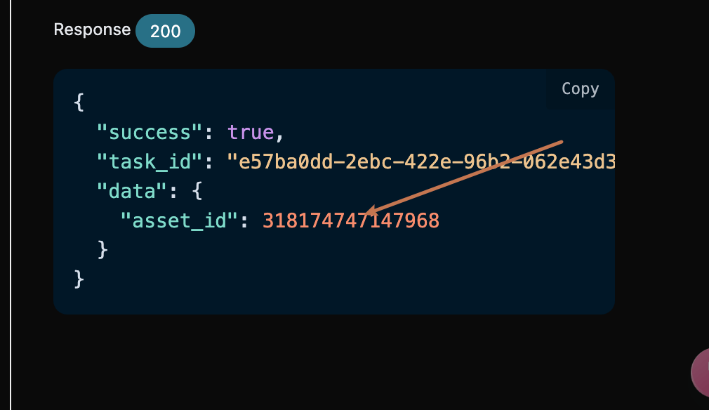 ID字段 asset_id,字段 asset_id 的获取是使用 Pixverse Character API来获取,具体的结果如下图所示: