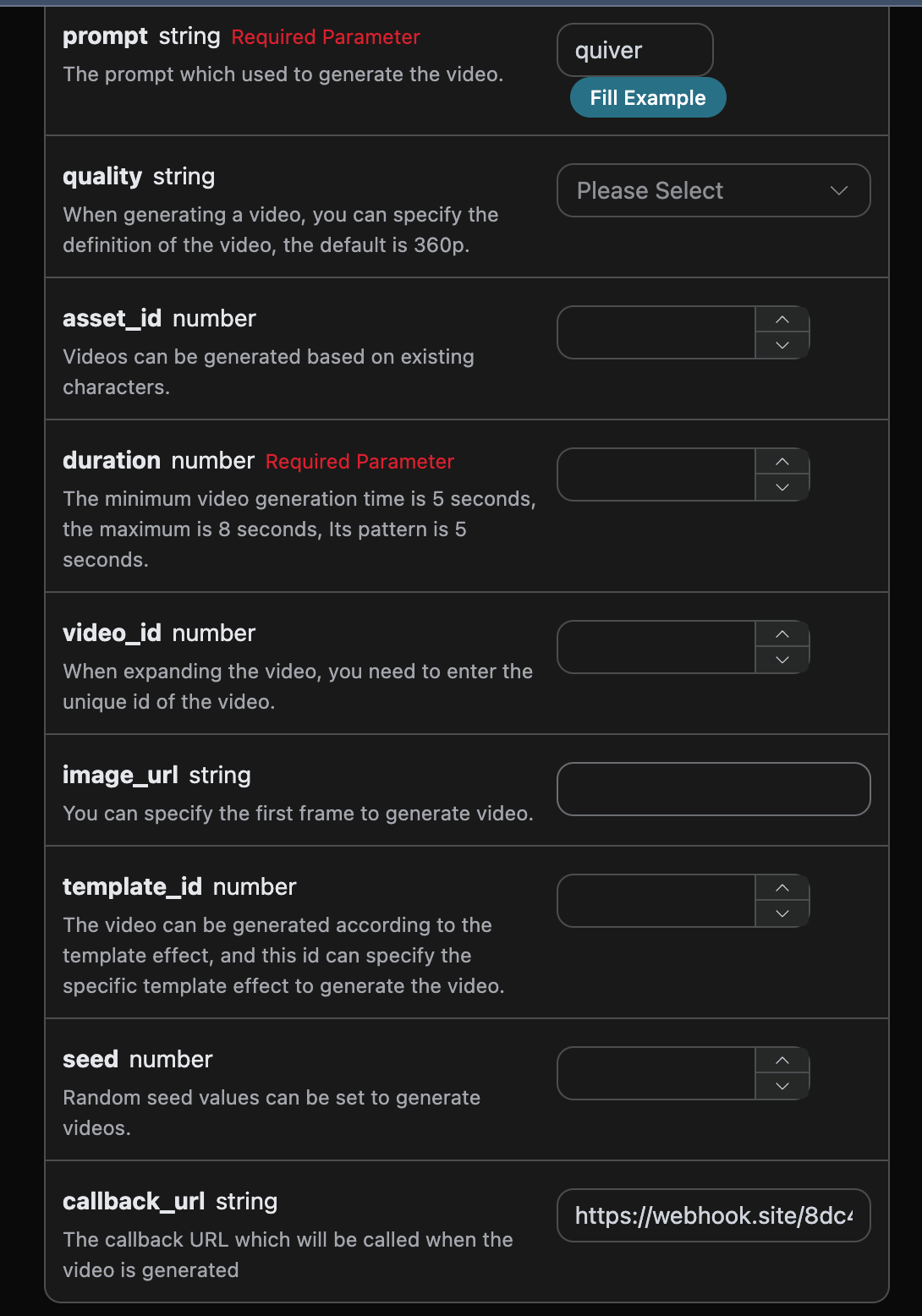 接下来,我们可以设置字段 callback_url 为上述 Webhook URL,同时填入 prompt,如图所示: