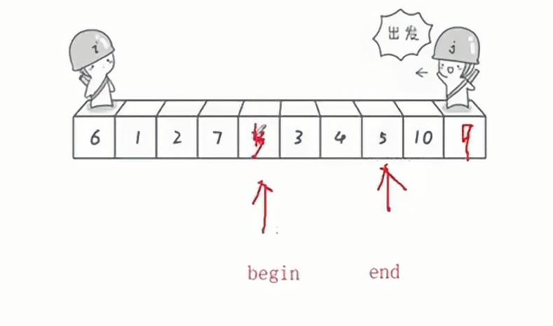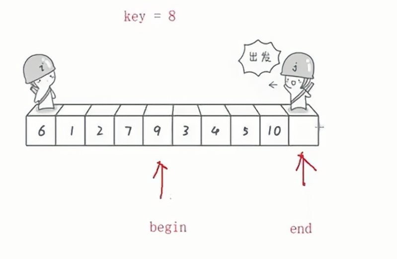 首先将最后一个数字作为key,指定两个指针,begin和end,begin的使命是找到一个比key大的数,end的使命是找到一个比key小的数,如果此时begin和end没有相遇,那么就将begin和end指向的值进行交换。