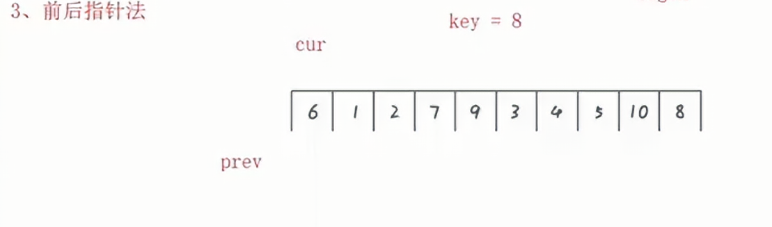 使用两个指针,prev和curr,如果curr找到比key小的数,那么prev就++,并且交换curr所指向的值。