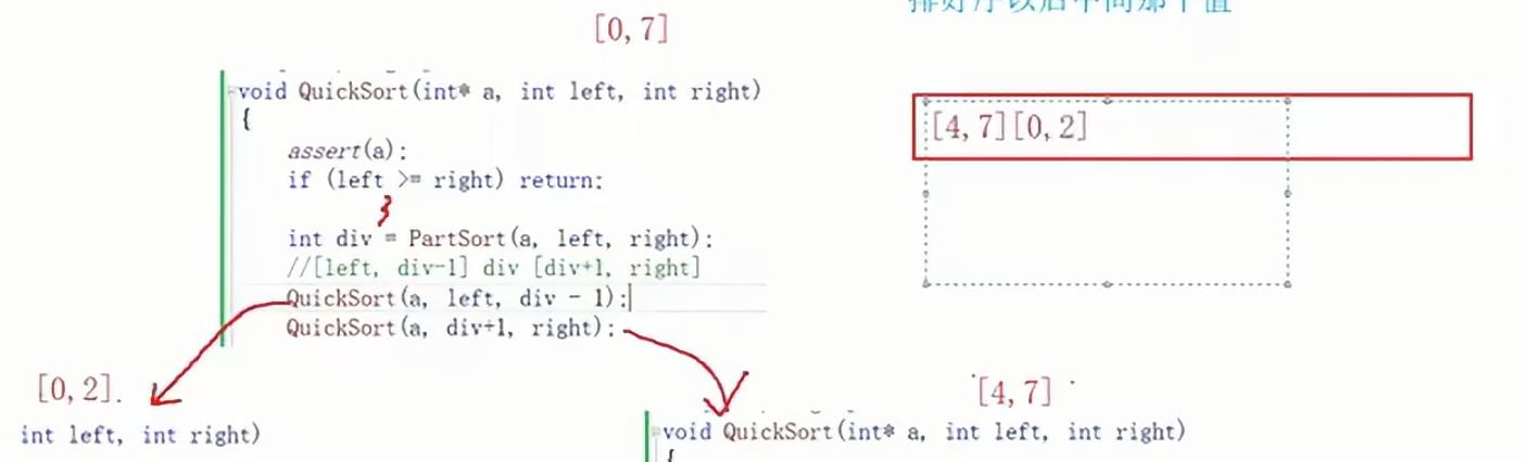 上面我们提到了,如何将一个数字变得有序,情况如下,当一个数字变得有序的时候,这个数据的左边是比它小的数,右边是比它大的数,此时分别递归左右两边的数组,就能完成所有数字的有序。
