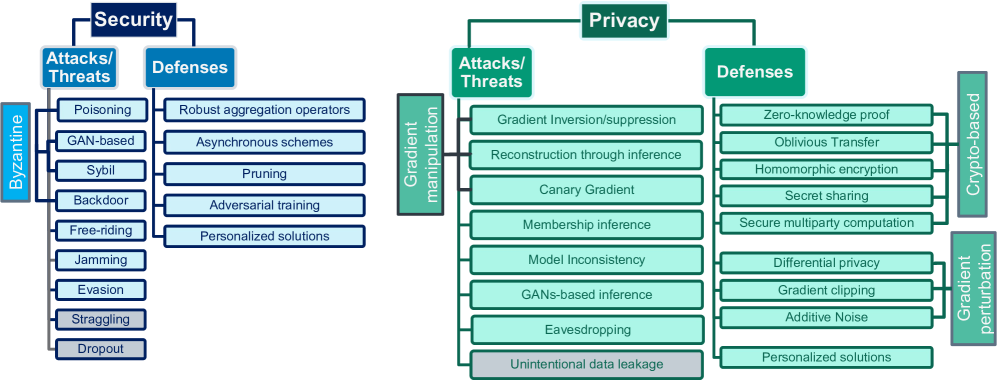 1、综合分类法:我们提供详细的 安全和隐私威胁的分类法以及相应的 佛罗里达州的防御机制。这些分类法作为结构化的 理解各种挑战和解决方案的框架 领域。
