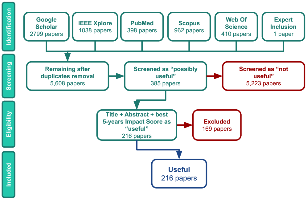 这项工作按照 PRISMA 办法进行了文献综述 检索并全面分析 FL 安全和隐私文献。图 111 描述了检索最相关论文的手段的每个阶段。文献综述解除了三个关键研究问题:识别最近的攻击和威胁、探索对策以及评估 FL 框架的实际应用。使用六个信誉良好的数据库(Google Scholar、IEEE Xplore、PubMed、Scopus、Web of Science),在三个主题上使用了 59 个搜索查询:攻击、防御和 框架(见表 222)。删除重复后,筛选出 2,002 篇论文 在关键词、标题、摘要和影响力分数上,最终缩小范围 评选出217篇影响力得分在5分以上的高质量论文。