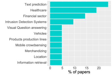 根据我们的文献综述,我们获得了在私密和安全环境中利用 FL 的应用领域。无花果。777 描述了每个领域对所分析论文的参与情况。应用安全和私有 FL 的前三个领域是文本预测、医疗保健和金融部门。长期以来,后者一直是使用最多的领域。尽管如此,有必要强调的是,近年来入侵检测框架领域在研究人员中获得了大力参与。以下小节描述了 FL 是如何在每个领域启用的,强调了一些挑战、攻击和防御。