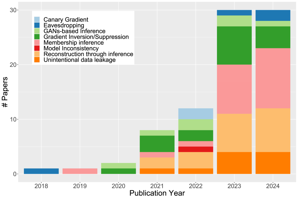 表 111 显示了对 现有调查(根据我们的文献综述过程发现 在第 111 节中解释),揭示了 整合这些主题。尽管文献数量不断增加,但我们观察到的局面是支离破碎的:大多数先前的调查都孤立地对待隐私或安全,通常列出威胁或防御措施,而没有将它们组织在一个共同的概念框架下。其他人则忽略了系统框架、应用领域或可扩展性权衡等实际问题。例如,胡等人。和 Hallaji 等人。关键地址 安全和隐私攻击/防御,但缺乏框架覆盖 和应用领域。同样,Nair 等人。, 和 Neto 等人。提供对特定领域的见解 例如安全防御或隐私问题,但没有集成这些 进入更广泛的分类法或讨论未来的方向。调查 作者:Liu 等人。和龚等 铝。重点关注安全攻击,但不 全面解决隐私或框架的应用。