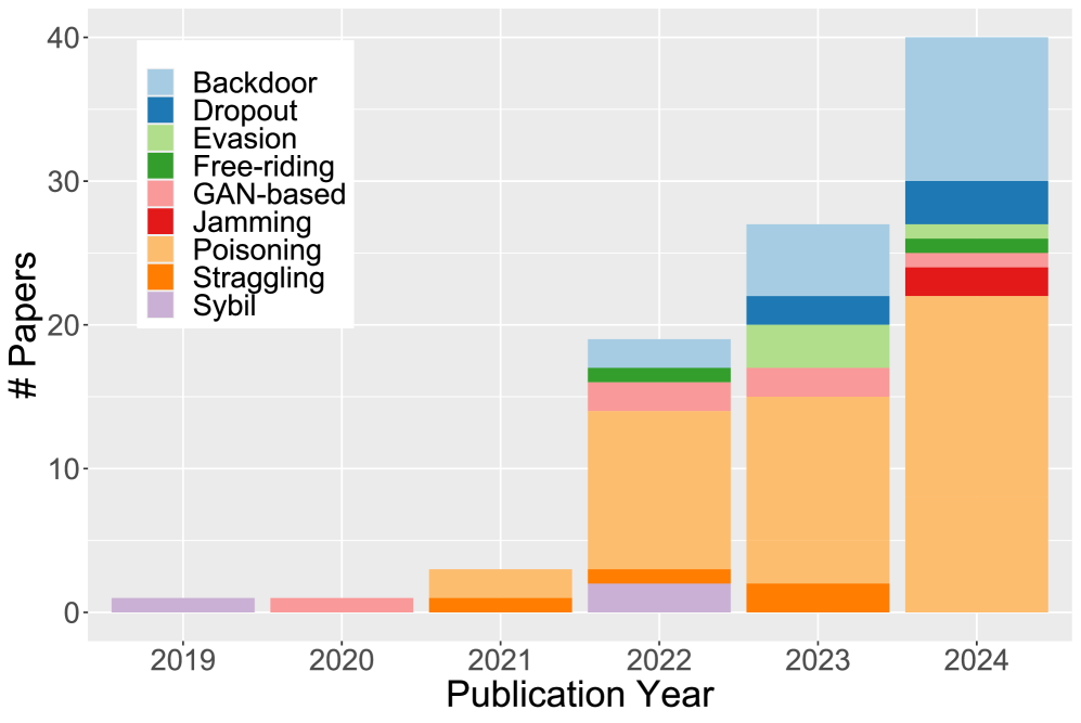 FL 的分布式特性使其容易受到各种类型的攻击,包括模型中毒、后门攻击、对抗性纵、数据和梯度泄露以及模型更新推理,非 IID 条件进一步破坏了差分隐私 (DP) 和稳健聚合等传统防御。应对这些挑战对于确保 FL 系统的稳健性、可靠性和可信度至关重要,特别是当它们越来越多地应用于医疗保健等敏感领域时金融和电信,除其他外。