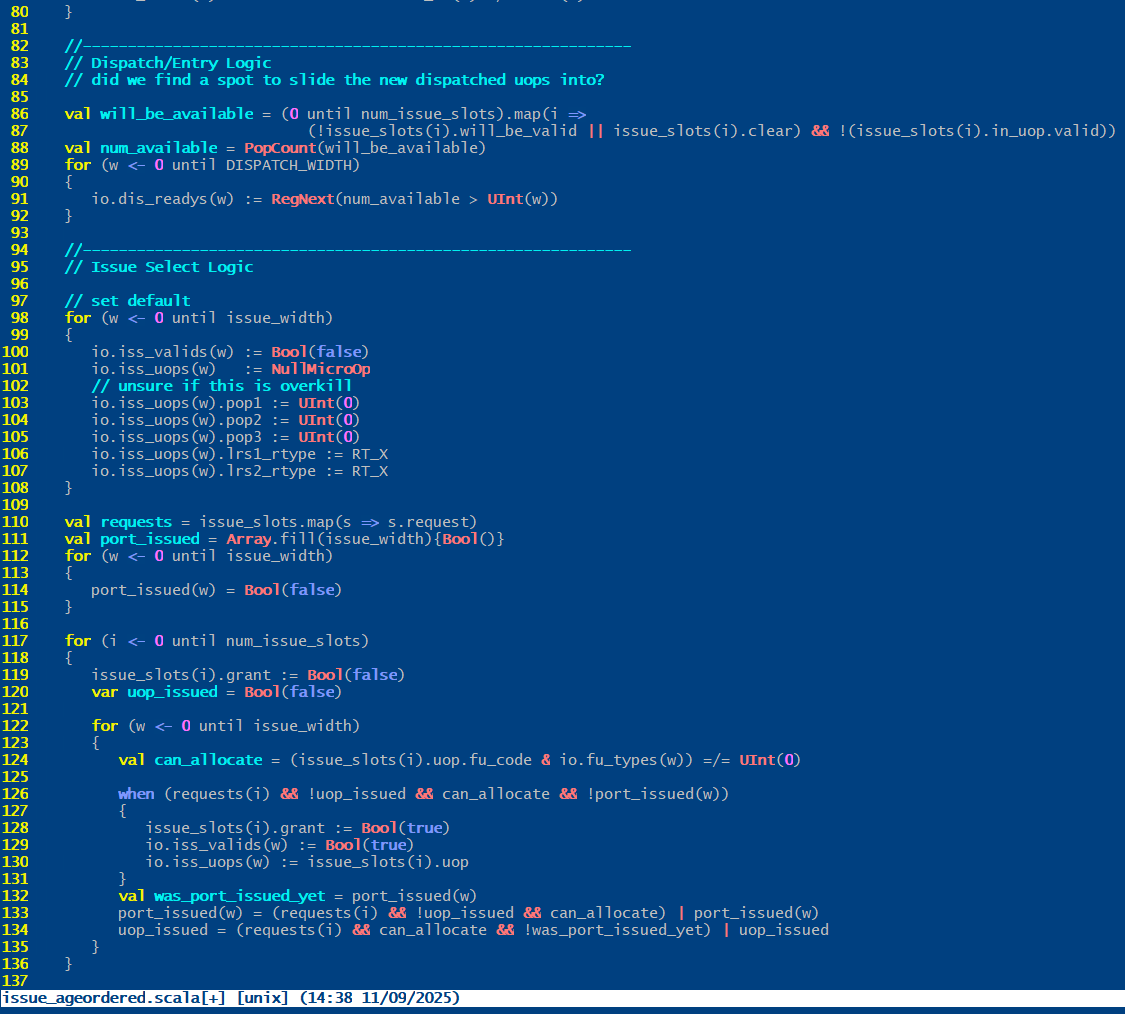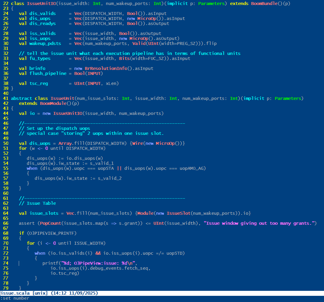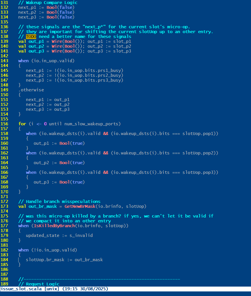----64~80行:给issue_slot(i).xxx赋值。每个发射槽管理一条指令的生命周期(等待操作数、就绪、发射)。大胆猜一下76行wakeup_dsts就是dst操作数(目标寄存器)Ready后wakeup的信号。