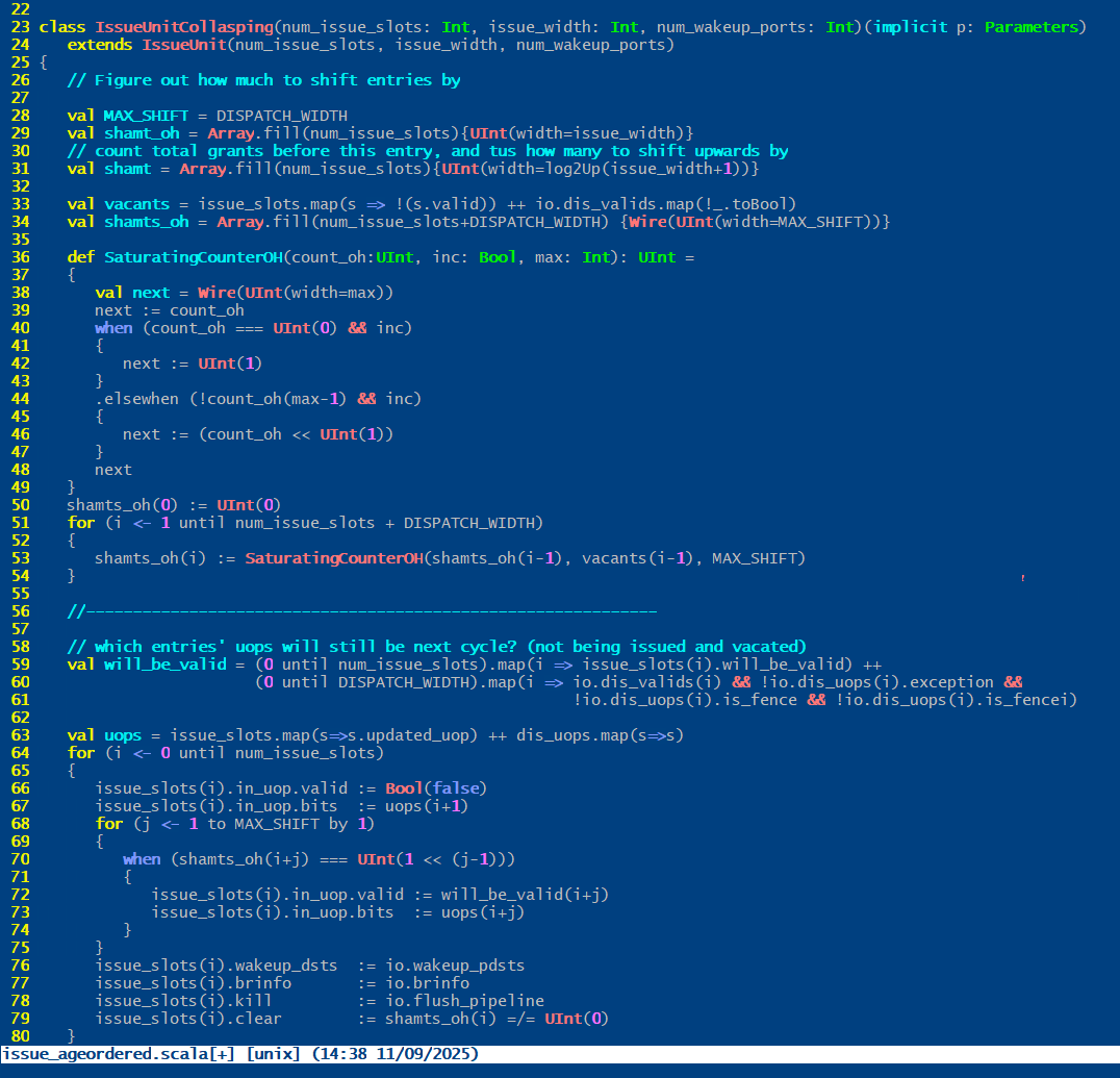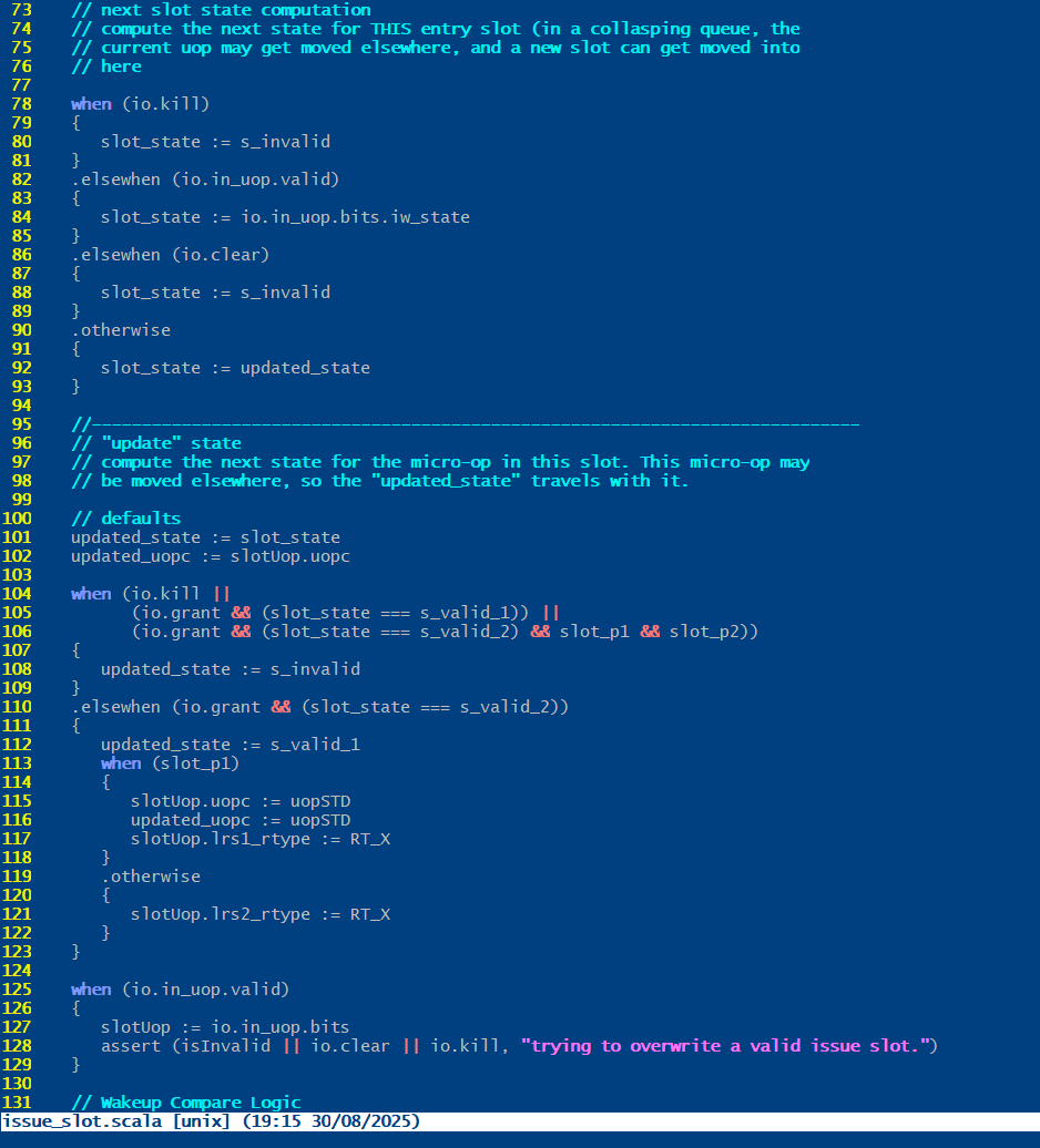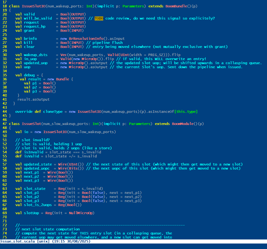----64~80行:给issue_slot(i).xxx赋值。每个发射槽管理一条指令的生命周期(等待操作数、就绪、发射)。大胆猜一下76行wakeup_dsts就是dst操作数(目标寄存器)Ready后wakeup的信号。