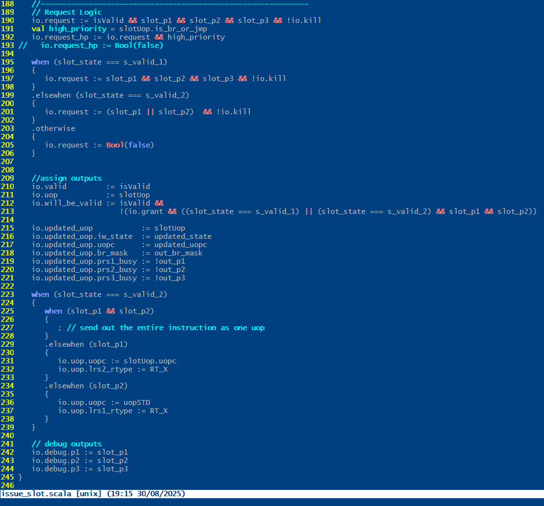 连线到了Issue模块的io.iss_uops(s)和io.iss_valids(i)上了!就是----209~239行:给io.update_uop和io.uop这两个位宽很大的信号赋值作为OUT。如前面所说,Issue_Slot整个都是Issue模块内部使用的,Issue_slot的io.uop和io.valid作为模块的OUT端口、最后